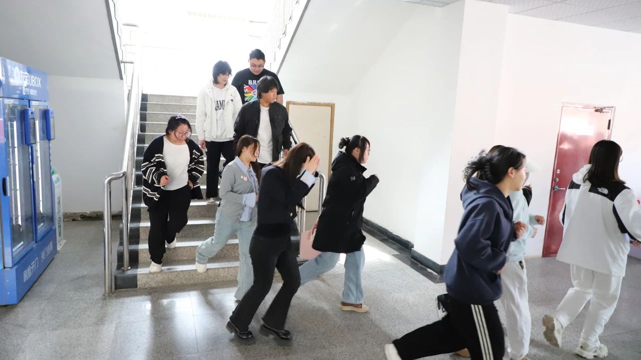 尖锐的地震预警响起后,疏散指令立即下达。各楼层安全员迅速就位,引导大家用手捂住口鼻,避免吸入烟尘。同学们按照指示,低着腰前行,沿着预定疏散通道稳步撤离,彼此自觉保持间距,防止拥挤推搡。整个过程紧张却有序,各部门配合默契,最终全体人员安全抵达体育场集结区,全程仅用时5分钟。