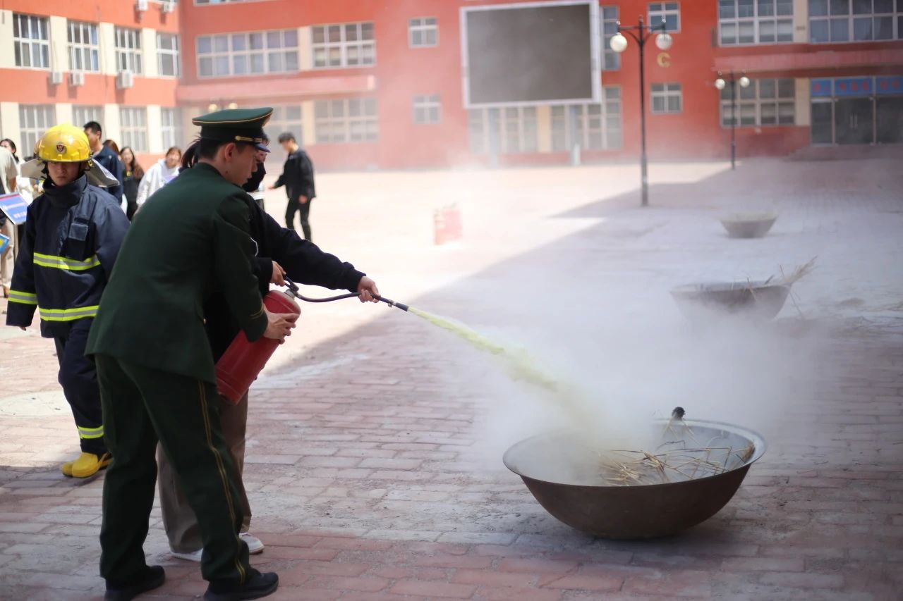 在实操演练中,师生使用灭火器按照“提”“拔”“握”“压”的动作要领进行了灭火的规范操作,在亲身体验过程中进一步掌握了干粉灭火器的使用要领。
