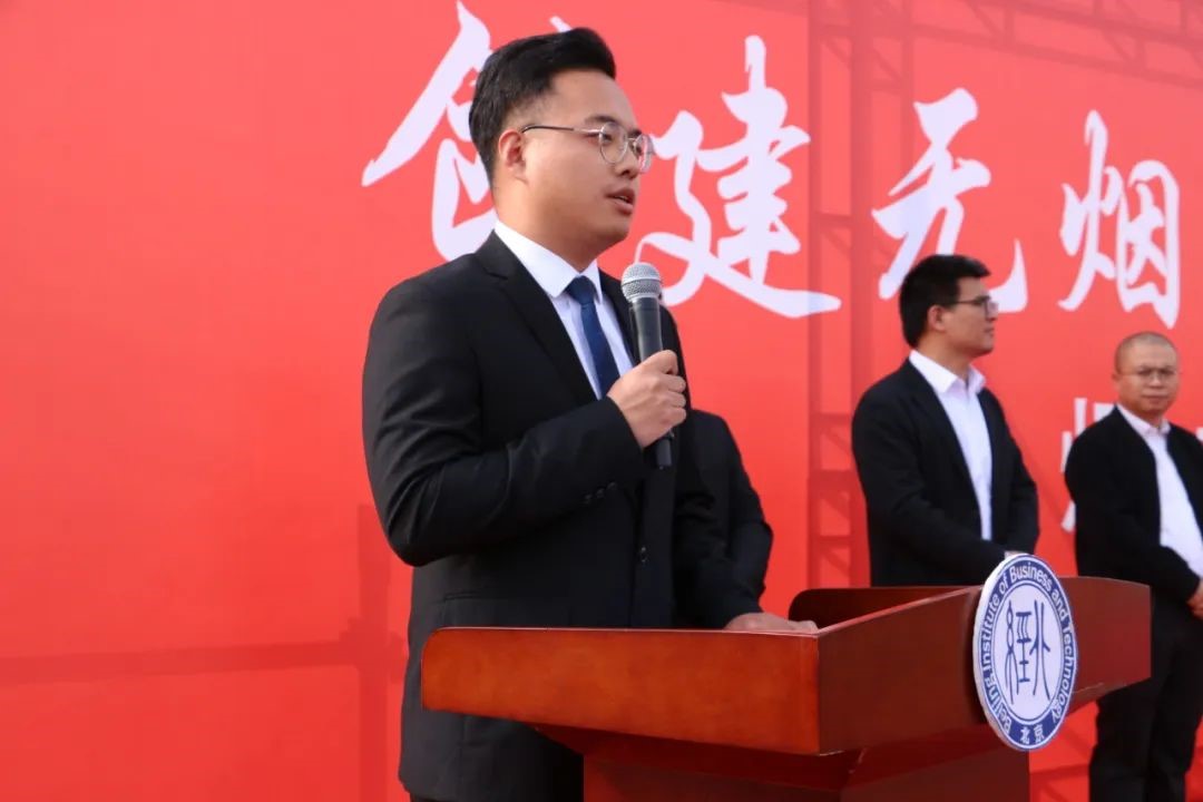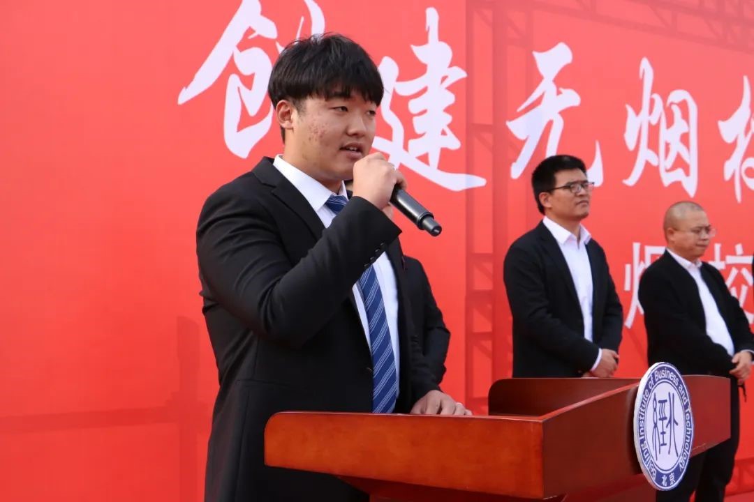 学生代表、2023级软件技术专业王廉正发言。他提议同学们要一起行动起来,远离香烟,为了争创良好的校风和学风,营造健康、文明、和谐的校园环境,一起努力!为养成良好文明的生活习惯,创设文明、洁净、优美的校园环境而共同奋斗!