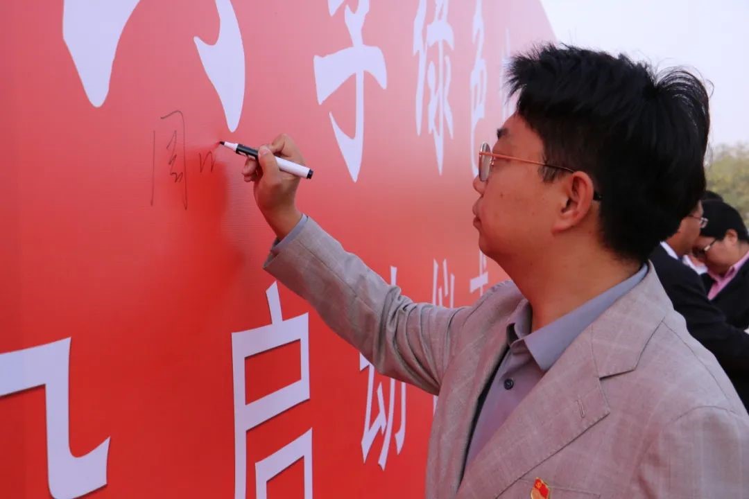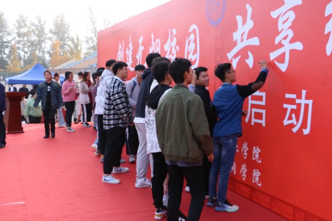 随后学院领导率先在背板上签名承诺建设无烟校园,师生代表也上台签名承诺。