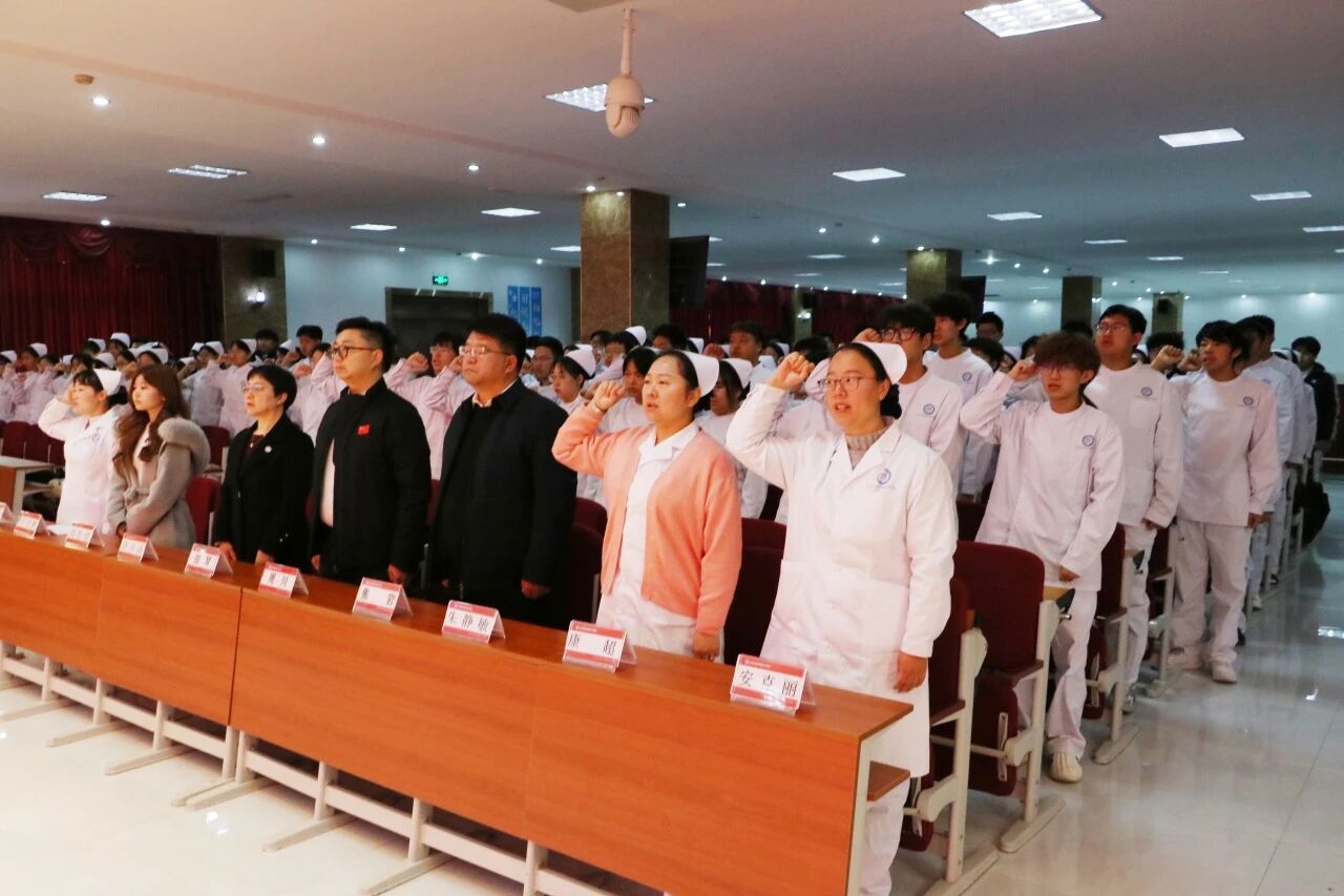 全体学生在史淑萍老师的带领下,整理着装,右手高举过肩,齐声诵读医学生誓言。 铮铮誓言不仅是对职业使命的承诺,更标志着学子们正式以“准白衣天使”的身份,开启了守护生命的征程。