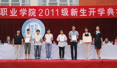 董事长、院长周宏教授为全国职业院校技能大赛英语口语技能比赛二等奖获得者外语系龚丹丹同学颁发奖杯及纪念品;院党总支书记李平为2009——2010年度北京市先进集体、北京市三好学生、北京市优秀学生干部获得者颁发奖状。