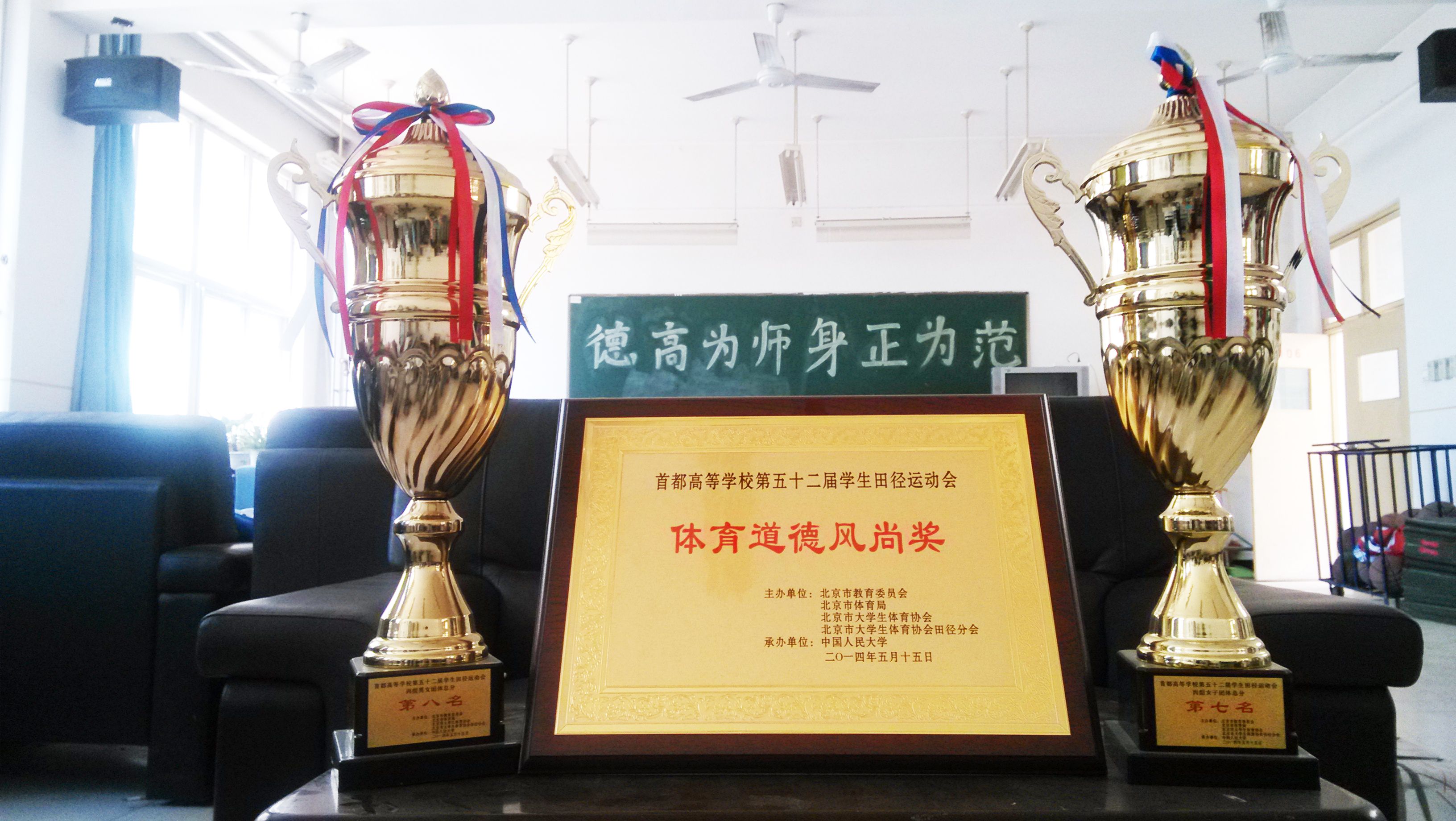 2014年5月15日—18日,在学院领导和各系各部门的支持下,我院田径代表队在领队李国杰,教练胡丽云、陈建春三位老师的带领下参加了在中国人民大学召开的第五十二届首都高校田径运动会。我院田径队荣获丙组女团第七名,男子团体第十名,男女总团体第八名的优异成绩,并获得体育道德风尚奖。