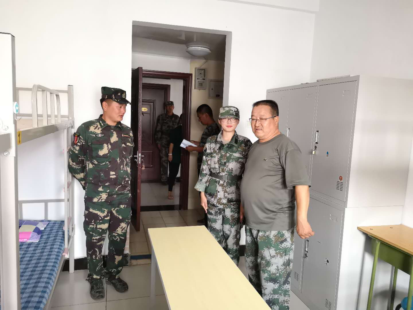 宿舍是学生生活和休息的重要场所。张院长走进新生宿舍,仔细察看了军训新生的内务整理情况。当看到新生寝室全部达到“被子方正、床铺平整、地面如镜”的内务要求后,张院长十分高兴,对他们的内务整理情况给予了充分肯定。