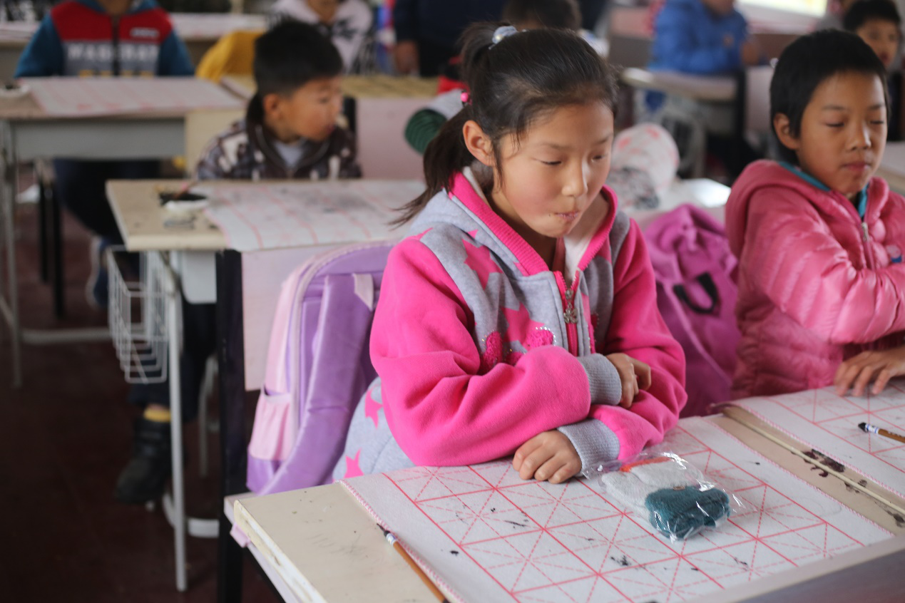 本周活动内容仍然是书法教育,孩子们对于书法课非常喜欢,他们走进教室便默默地找到自己位置,等待志愿者给他们发放毛毡、毛笔、笔画练习纸、还有墨汁。看着他们像一个个小大人似的,给志愿者讲书法应该要怎么写才好看,整个教室很快就变成书法小课堂。