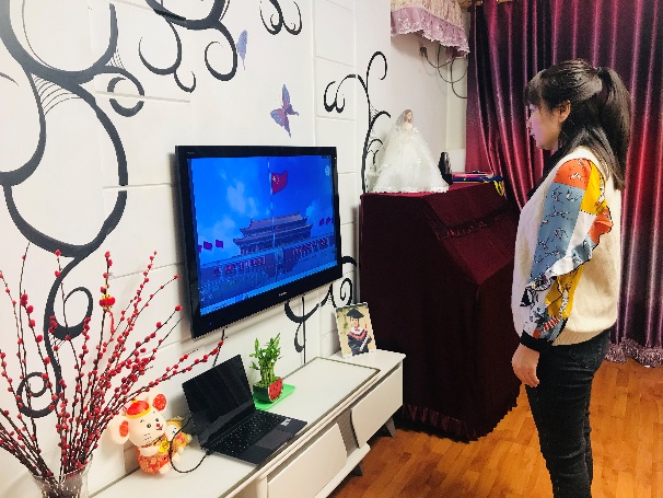 2019级计算机应用技术专业张宇同学:疫情阻断了我们返校的步伐,但是停课不停学,今天是开学的第一天,也是网课的第一天。隔山隔水不隔情,封城封路不封心。我们各自在家里,大家跨越疫情和时空的阻隔,举行一次简单却颇具意义的升国旗仪式,共同表达热爱祖国、共抗疫情、共度时艰的坚定信念,为武汉加油,为中国加油。人可隔山海,爱国情更坚。这次特殊的升旗仪式成为了疫情防控特殊背景下的一场生动的爱国教育课,让我感受到了中国精神的力量,坚定了同舟共济、战胜疫情的信心,激发着我们每个人的爱国之情。疫情终会过去,春天必将来临,成长亦不会缺席。相信我们全校同学必能以无数逆行英雄为榜样,展现新时代青年的使命与担当,将健康自己、强壮自己作为对抗击疫情最大的贡献,齐心协力,共克时艰,静待春暖花开,重聚校园。