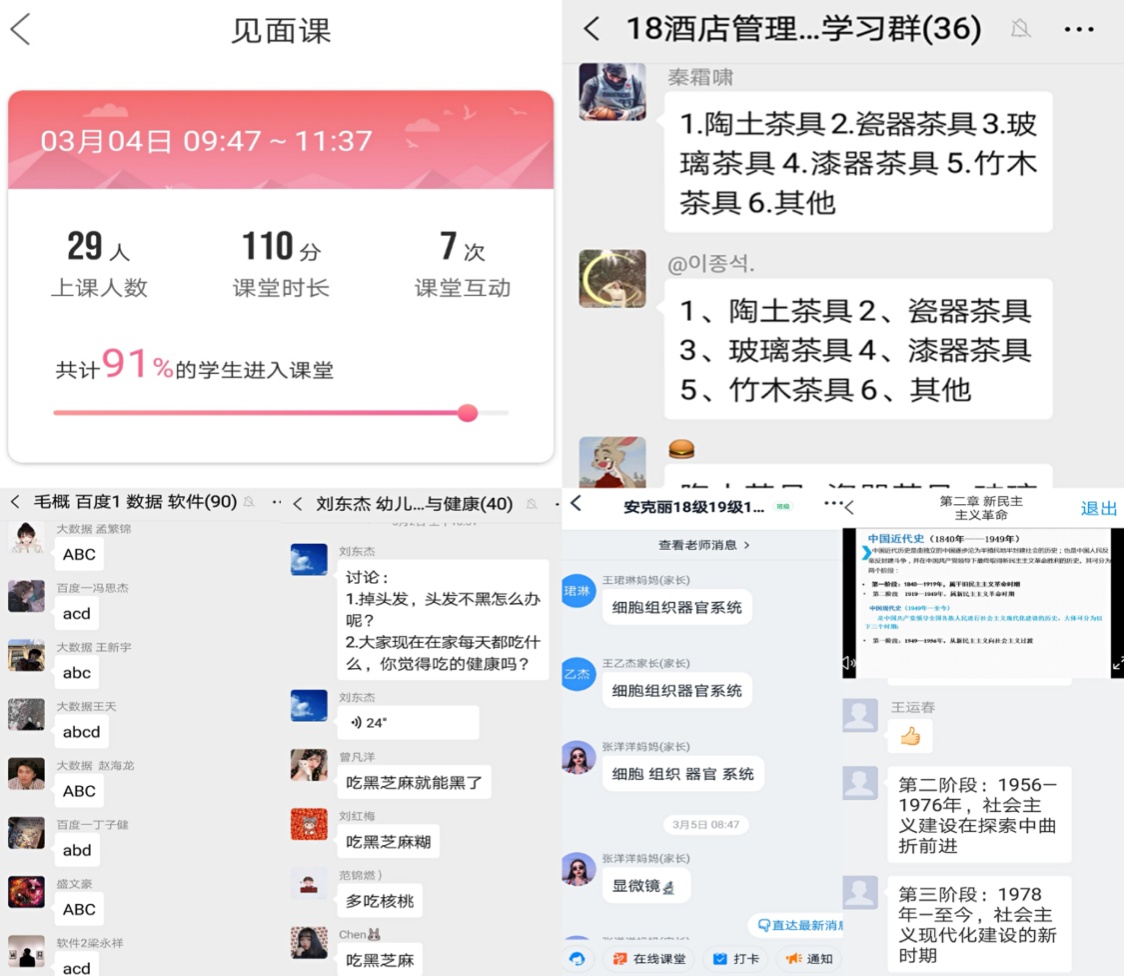 经过一周的探索与实践,目前教师和学生都已适应了线上教学模式,课堂互动配合默契,很是活跃。有的老师说,“学生很给力,线上课堂互动比线下还要好”。甚至有的课堂讨论很热烈,因为教师在传授知识的同时也能引导学生关注疫情防控期间涌现出的先进事迹,将课程思政和专业教育有机融合。