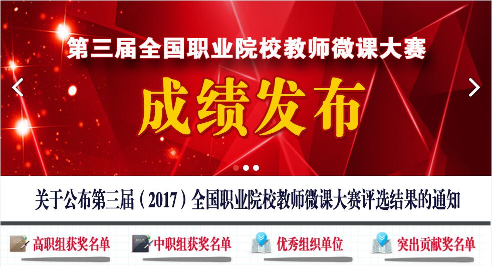 为深入贯彻落实《教育部关于加快推进职业教育信息化发展的意见》等文件精神,不断加强职业院校优质教学资源建设,持续深化信息技术与职业院校教育教学的融合发展。由中国职业技术教育协会牵头的全国职业院校教师微课大赛组委会于2017年4月至12月举办了“第三届全国职业院校教师微课大赛”。
