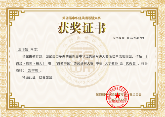 王培勤老师“诗教中国”诗词讲解作品《诗经·周南·桃夭》获大学教师组优秀奖。