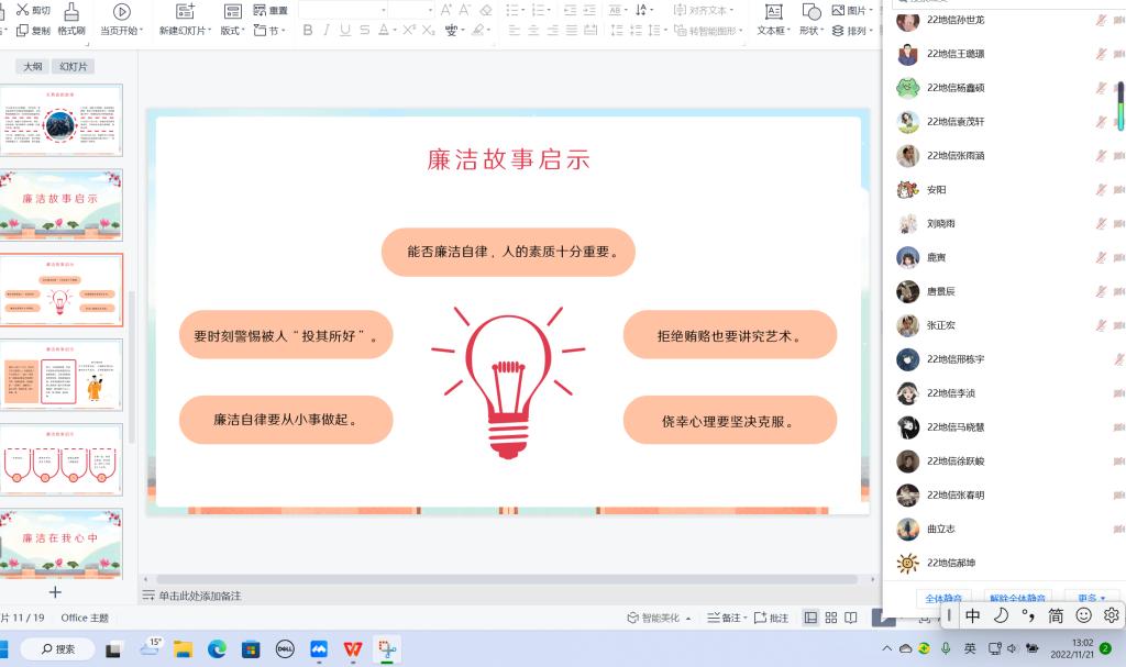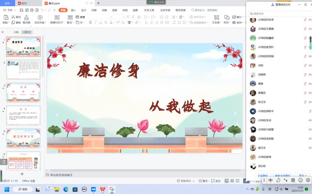 为培养同学们清正廉洁的道德观念,树立廉洁自律风气,弘扬校园正能量,引领社会廉洁风尚,11月19日,开元集团网站各班以线上的方式在腾讯会议召开了“廉洁修身,从我做起”主题团日班会。