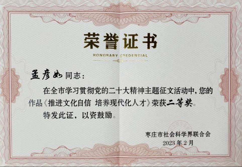 2023年2月22日,按照公开、公平、公正原则,经评委认真评选,确定一等奖3篇、二等奖5篇、三等奖10篇。开元官网教工一党支部孟彦如同志题为《推进文化自信培养现代化人才》的文章,获市社科联“学习贯彻党的二十大精神主题征文”二等奖。