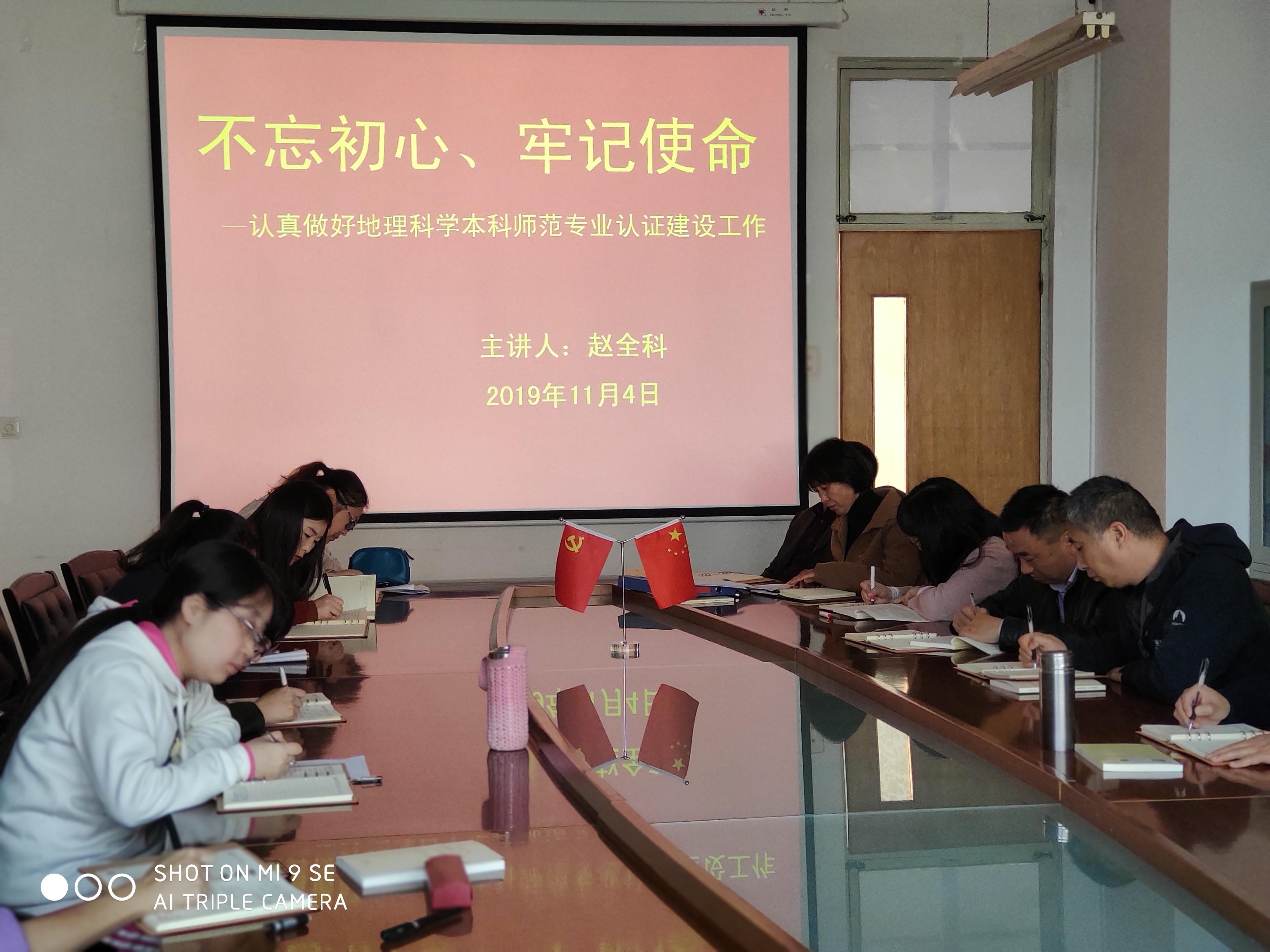 按照学校“不忘初心、牢记使命”主题教育工作部署与要求,11月4日下午,开元集团网站在理工楼2514会议室开展主题教育专题党课活动,院长赵全科讲了题为《不忘初心 、牢记使命—认真做好地理科学本科师范专业认证建设工作》的党课,全体党员聆听了党课。