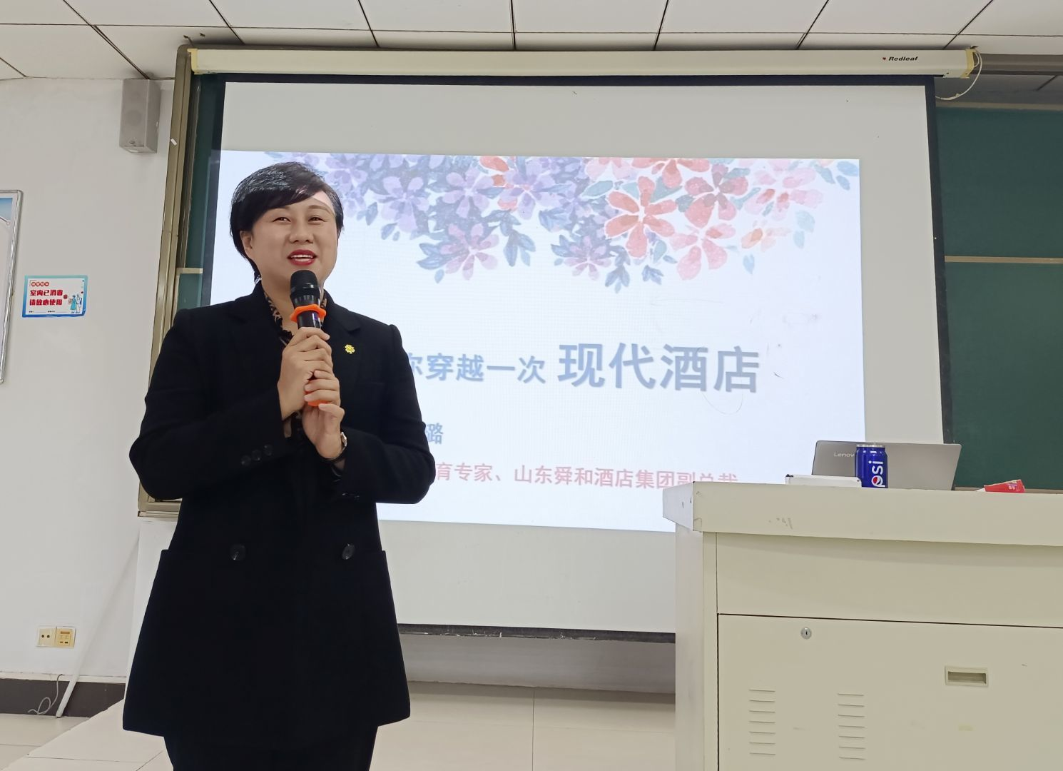 4月10日,开元集团网站邀请山东省旅游行业教育专家、舜和酒店集团副总裁白璐女士作题为《走,带你穿越一次现代酒店》的报告。旅游管理专业负责人孙倩蓉博士主持报告会,2022、2023旅游管理、酒店管理专业全体学生聆听了此次报告。