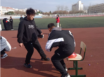第三项:合力吹气球,每个班4人参赛队员分别代表“嘴”、“手”、“脚”、“屁股”“嘴”吹起气球拿给“手”打结,“手”传递给“脚”,“脚”夹住气球传递给“屁股”,“屁股”最终将气球坐爆。比赛过程中气球掉落时间加五秒,一组两个气球,时间短的队伍获胜。此项游戏旨在培养团队默契能力,认识团结合作的重要性。