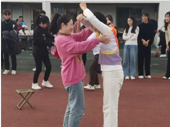 第二项:穿衣接力,每队四人,每队准备一件五粒纽扣的衣服,在起点将衣服穿好,裁判发令后跑到终点,把衣服脱掉后给队友穿上,然后从终点处跑至起点,以此类推。时间最短者为胜。此游戏提高了学员的团结协作能力与凝聚力。