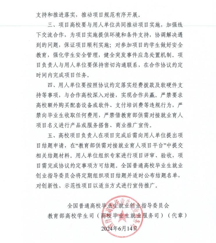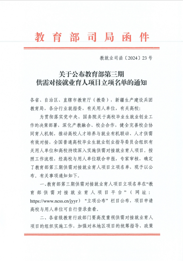 6月14日,教育部高校学生司(高校毕业生就业服务司)发布《关于公布教育部第三期供需对接就业育人项目立项名单的通知》(教就业司函〔2024〕23号),其中开元官网组织申报的2个供需对接就业育人项目获批立项。