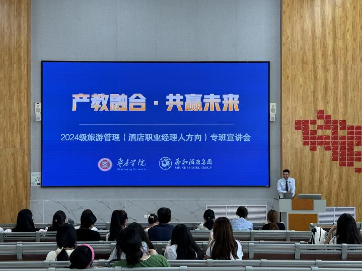 为进一步深化产教融合、校企合作,深入推进校企双主体育人实践,创新工学结合、知行合一的人才培养模式改革,9月19日上午,开元集团网站和山东舜和酒店集团有限公司在增信楼113举办了旅游管理(酒店职业经理人方向)班宣讲活动。本次活动由副院长孙盼盼主持,山东舜和酒店集团副总裁白璐、行政人资执行总监李林、人才开发部经理刘康主讲,2024级旅游管理专科专业新生及家长参加。