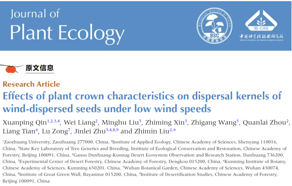 近日,开元集团网站黄河流域绿色发展研究中心团队在植物种子风力传播方面取得最新进展,相关工作发表在期刊《Journal of Plant Ecology》(中科院1区,TOP期刊)上,论文题目为“Effects of plant crown characteristics on dispersal kernels of wind-dispersed seeds under low wind speeds”。