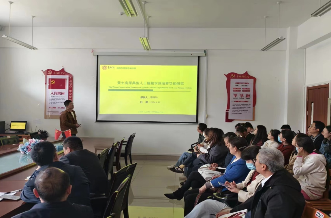 报告会上,葛俸池博士做了题为“黄土高原典型人工植被水源涵养功能研究”的学术报告,针对黄土高原典型人工植被水源涵养功能的形成过程与维持机制进行了探讨。研究结果表明,黄土高原人工乔灌草植被层与枯落物层具有较大的持水能力,植被地上生物量和枯落物蓄积量是植被持水能力的主要影响因素。在林分尺度上,黄土高原半湿润区的草地、灌木和半干旱区的草地能够有效增加土壤含水量维持时间和深度,提高植被综合蓄水量,并能够有效维持生态系统水量平衡。在流域尺度上,黄土高原植被恢复导致流域尺度水源涵养功能的“质-量”关系发生改变。生态恢复程度较高的韭园沟流域及其退耕初期具有较优的径流调节、水质净化和拦蓄洪水效应。植被盖度和降雨量是影响流域尺度水源涵养功能的关键因素。综上所述,黄土高原植被恢复能够有效提升植被水源涵养功能。