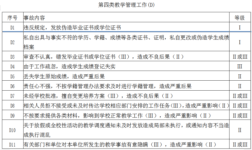 第十四条对于Ⅰ级教学事故,由教务处、人事处审核提出处理意见,由学校做出处理决定。对事故责任人给予全校通报批评,扣发全年绩效津贴,取消三年内晋级和评先树优资格。造成严重后果者,调离教学岗位,给予行政处分直至解聘。