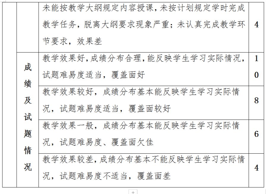 教师课堂教学质量评价综合分数在90分以上,且排名在全院前15%者为优秀;评价综合分数在76分以上,但未达到优秀等级者为良好;评价综合分数在75-60分之间者为及格;评价成绩在60分以下者(不含60分)为不及格。任课教师该学期内出现一般责任性教学事故者,其本学期课堂教学质量不得评定为优秀等级;出现严重教学事故者,评价等级为不合格。