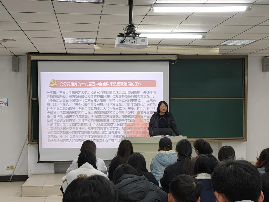 大会伊始,邵书记向同学们传达了党的十九届六中全会精神,从全会内容、全会形式、中国共产党的的辉煌成就以及认真学习贯彻六中全会精神的重大意义等方面展开阐释。邵书记指出,要以更高的政治站位和更强的政治自觉,深刻把握全会精神的丰富内涵和实践要求,不断增强“四个意识”、坚定“四个自信”、做到“两个维护”,立大志、明大德,成大才、担大任,不负时代、不负韶华,努力成为堪当大任的时代新人。
