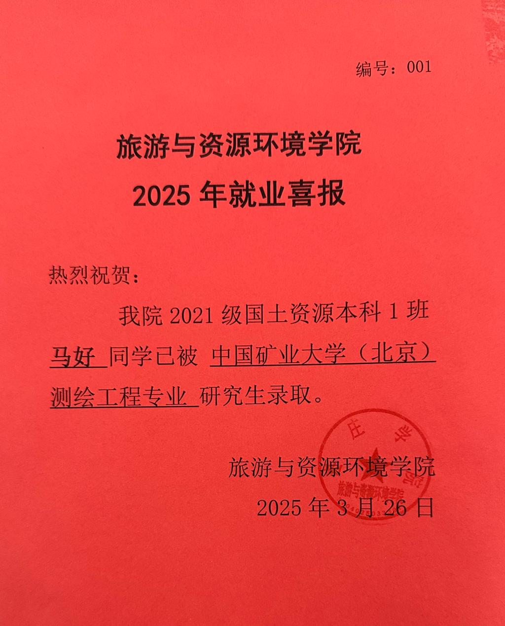 喜报!21国土资源本科1班马好被中国矿业大学(北京)录取!