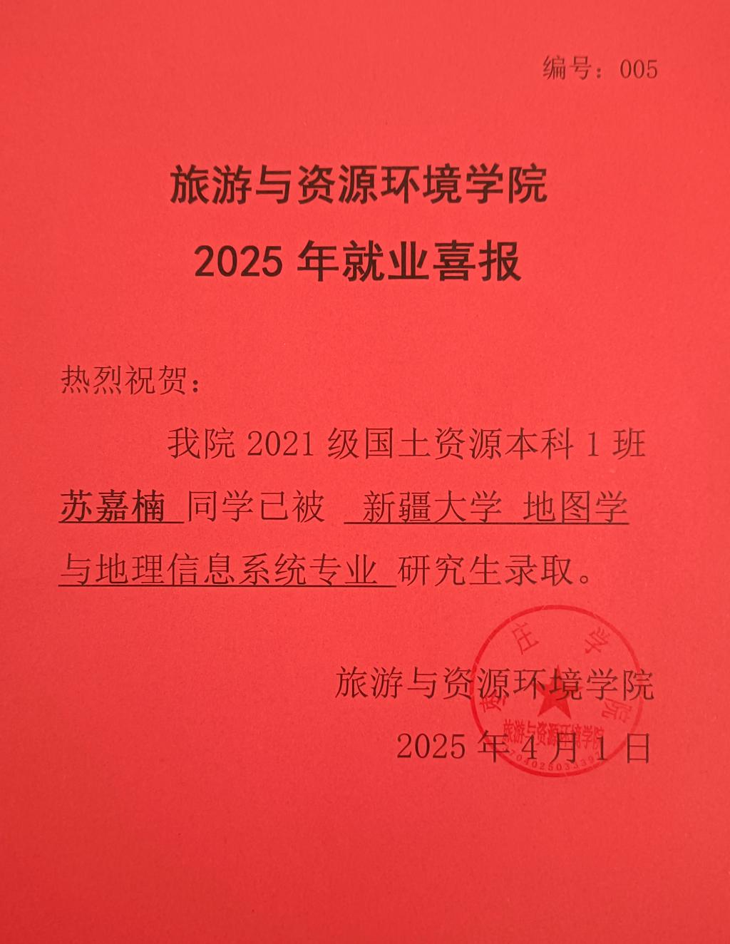 喜报!21国土资源本科1班苏嘉楠被新疆大学录取!