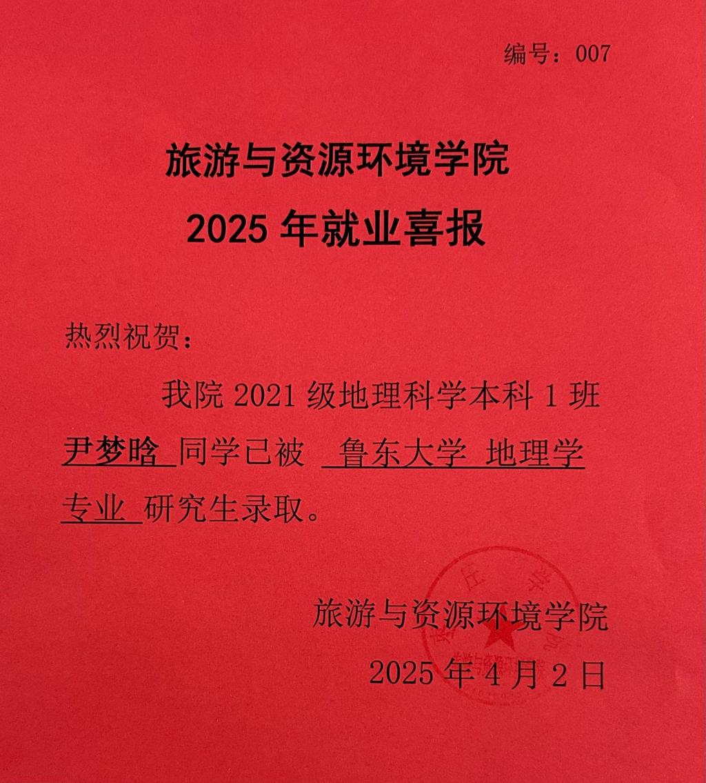 喜报!21地理科学本科1班尹梦晗被鲁东大学录取!