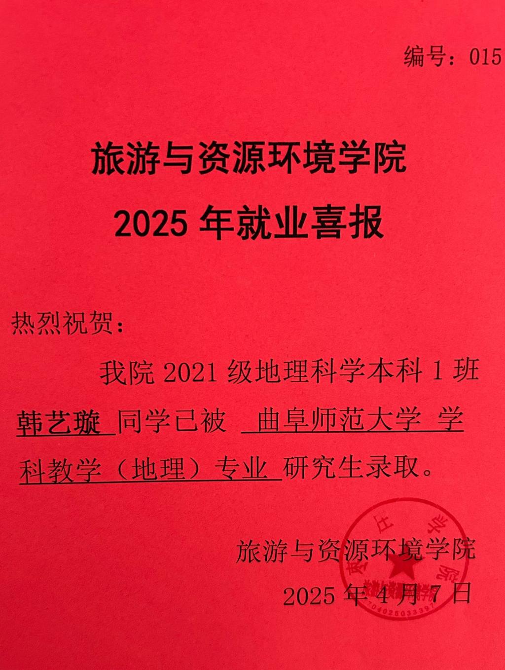 喜报!21地理科学本科1班韩艺璇被曲阜师范大学录取!