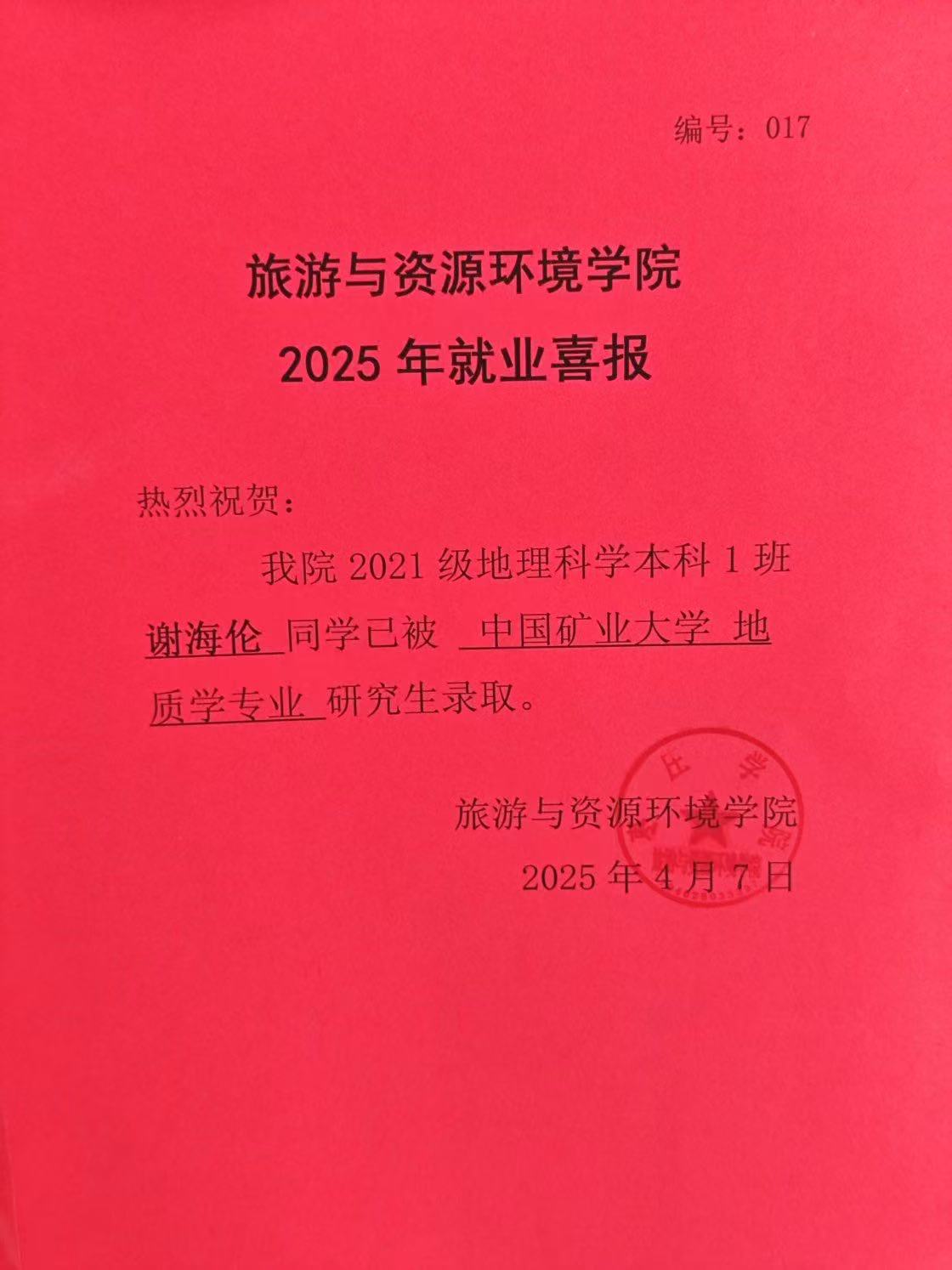 喜报!21地理科学本科1班谢海伦被中国矿业大学录取!